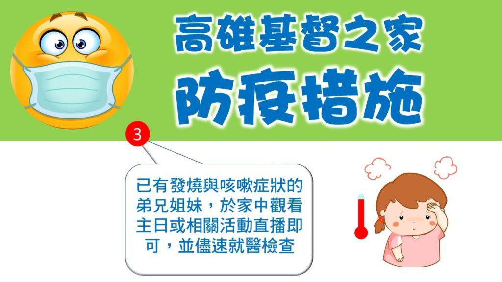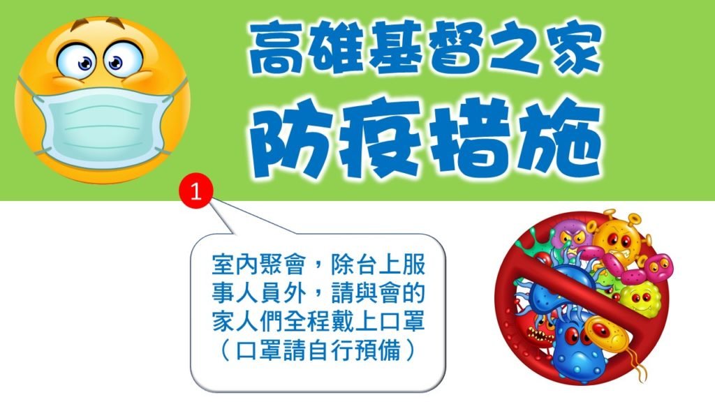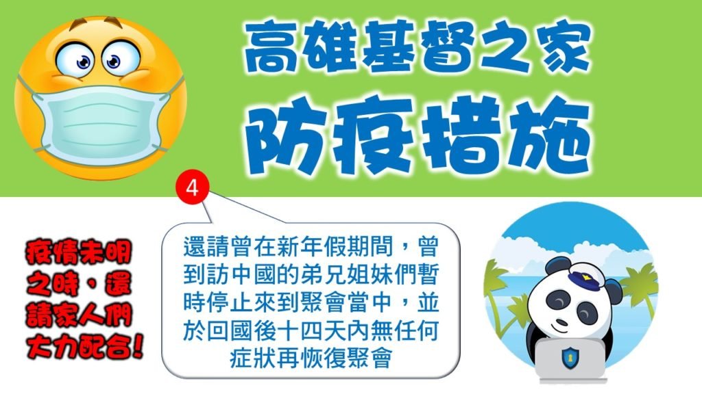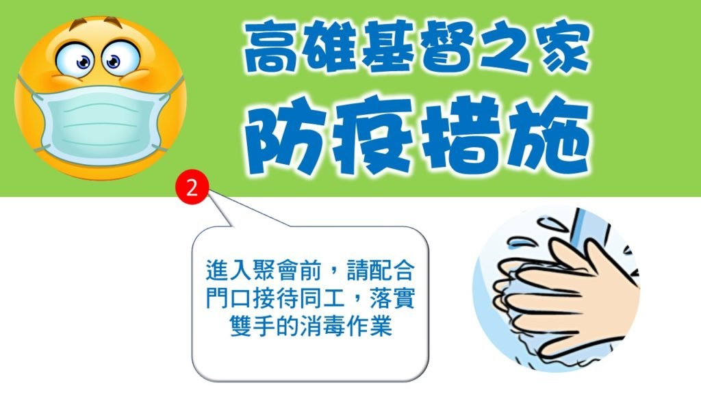 高雄基督之家防疫措施公告Post author:高雄基督之家Post published:02/11/2020Post category:每日靈修禱告 / 教會消息為因應目前武漢肺炎疫情,高雄基督之家目前採取以下四個因應對策1.室內聚會,除台上服事人員外,請與會的家人們全程戴上口罩(口罩請自行預備)2.進入聚會前,請配合門口接待同工,落實雙手的酒精消毒作業3.己有發燒或咳嗽症狀的弟兄姊妹,請於家中觀看主日或相關活動直播即可,並儘速就醫檢查 4.請曾在新年假期間,曾到訪中國內地的弟兄姊妹們,暫時停止參加聚會,並於回國後14天內無任何症狀後再恢復聚會高雄基督之家關心您的健康! Tags: 教會消息Read more articles Previous Post2020.02.11(週二)基督之家同心守望禱告網 Next Post每日親近神 2020/02/12 詩篇 第169天 高雄基督之家 高雄基督之家 You Might Also Like 每日親近神 2020/04/23 傳道書 第13天04/22/2020 2022/02/07 恩典365 – 關鍵的時刻 安靜在神的面前02/06/2022 2023/9/15(六)高雄基督之家同心守望禱告網09/16/2023